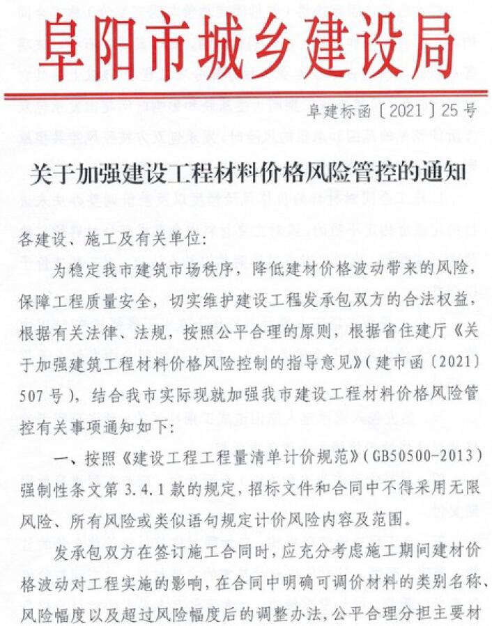阜阳市城乡建设局关于加强建设工程材料价格风险管控的通知(阜建标函[2021]25号)